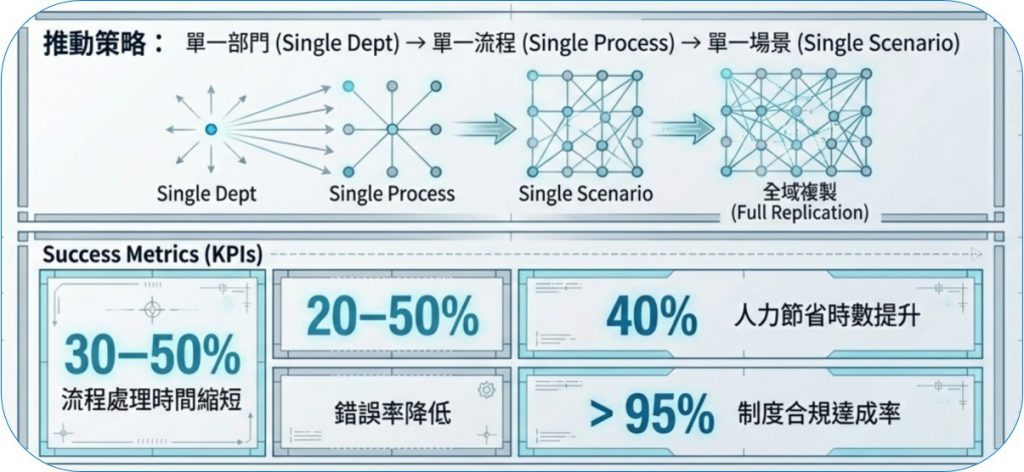 當效益清楚呈現,再快速複製到其他流程,形成 單點到全域 的自動化擴散模式,快速實現企業級 AI 流程落地。