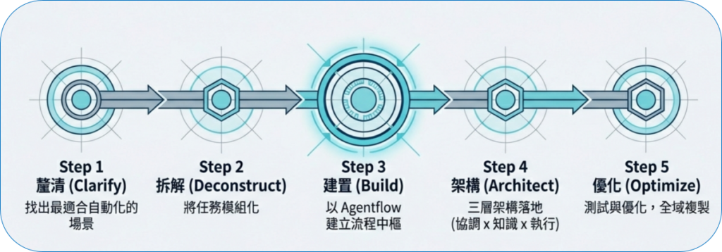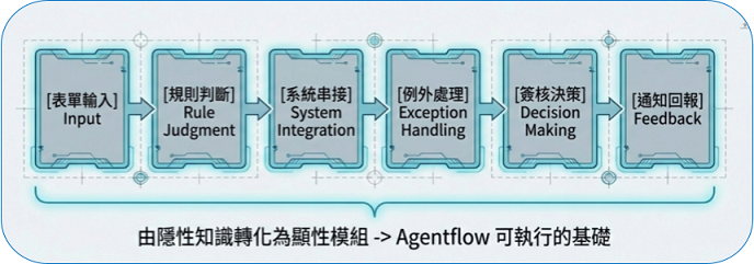 流程若只存在於人腦,就無法自動化。故必須拆解,當流程被模組化後,才具備可設計、可追蹤、可自動化、可優化等後續可由AI接手的特質,這也是 Agentflow 的核心能力基礎。
