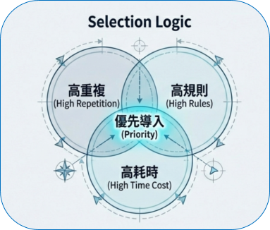 AI 並非從最複雜開始,而是從高重複 × 高規則 × 高耗時的優先盤點,此階段目標只有一件事,把混亂流程說清楚。