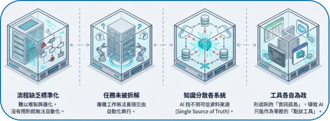 - 知識分散各系統,AI 找不到可信資料來源