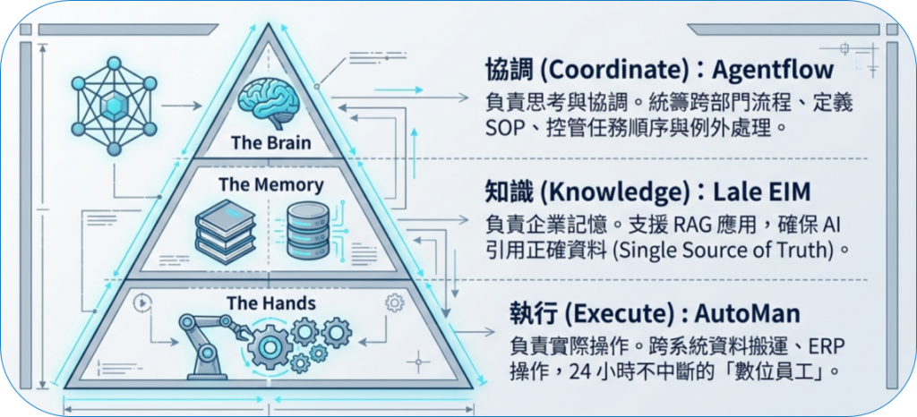 要真正可落地的 AI 自動化,必須同時具備三種核心能力:協調流程 × 掌握知識 × 自動執行
