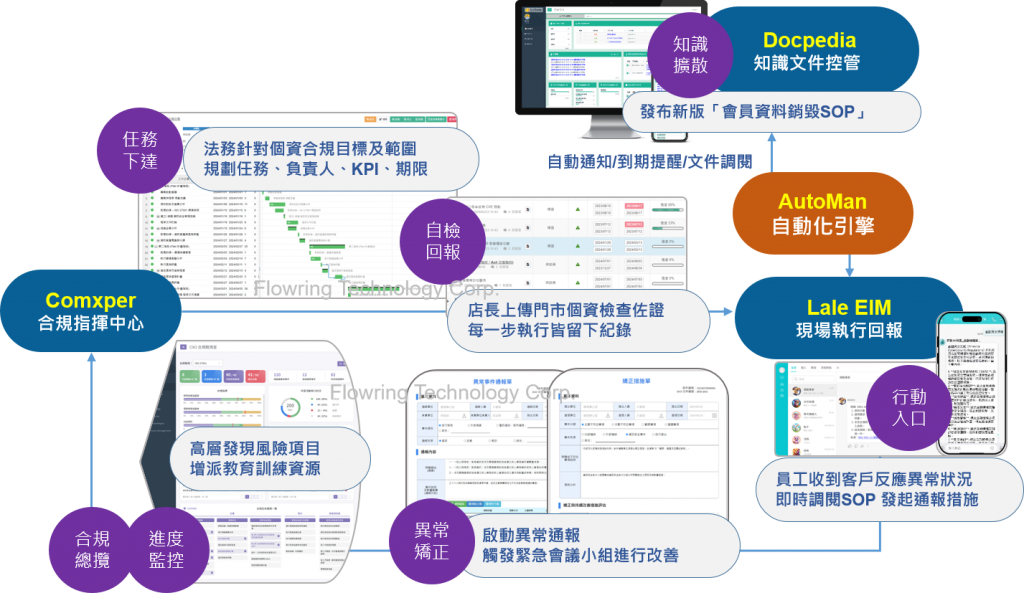 華苓建議零售業建立雙核心架構:「Comxper 合規管理平台」+「Docpedia 知識文件管理平台」+「AutoMan 流程自動化機器人」+「Lale EIM 企業即時通訊」,形成由總部治理到門市執行的一體化閉環管理。