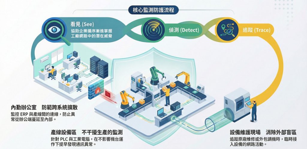 Secorion以「看見、偵測、追蹤」的監測流程,協助企業一步步掌握工廠網路中的潛在威脅。