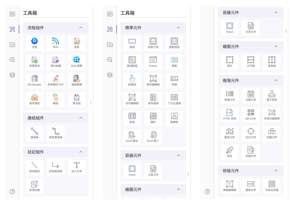 支援行動端專用元件,如 GPS定位、手寫簽名、拍照上傳、條碼與QR Code掃描,打造真正行動化、可延伸至App的表單體驗。