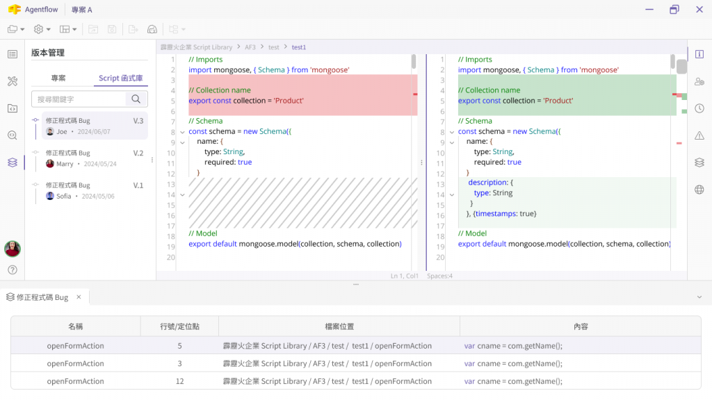 Agentflow 採用 Git 版本管理機制,每一個流程、表單或 Script 函式庫的修改都能完整追蹤。無論是回溯錯誤、比對差異或審核流程演進,都能快速定位與還原點,確保流程品質與合規性。