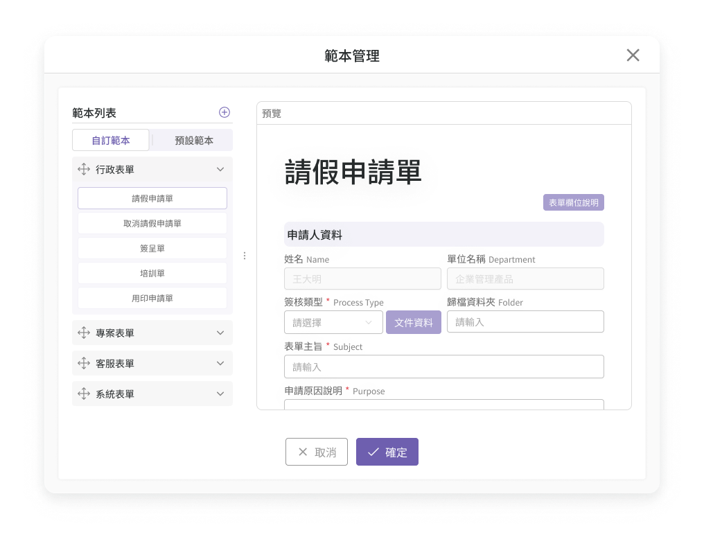 豐富的表單範本庫與拖拉式設計介面,讓新手也能輕鬆上手。
