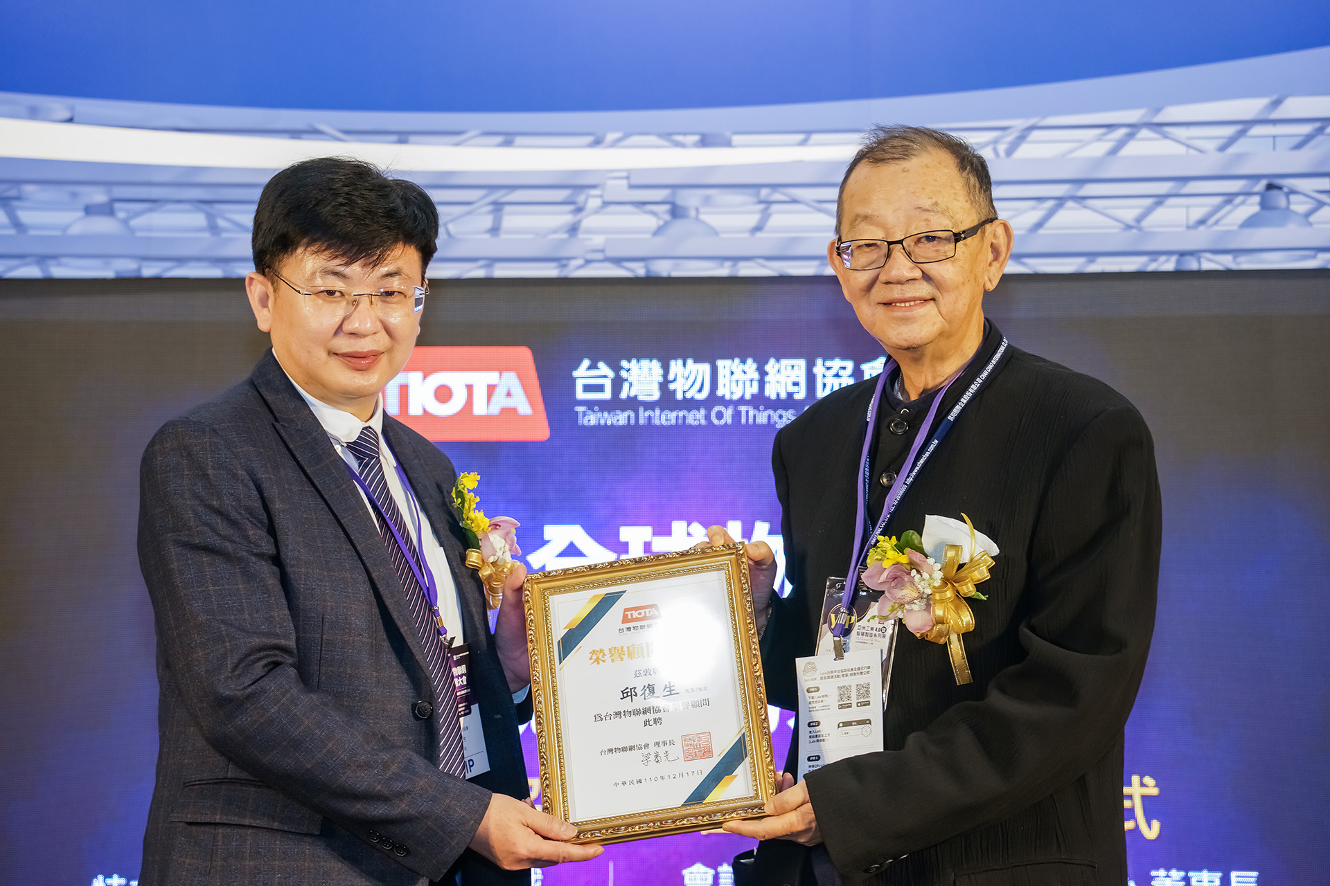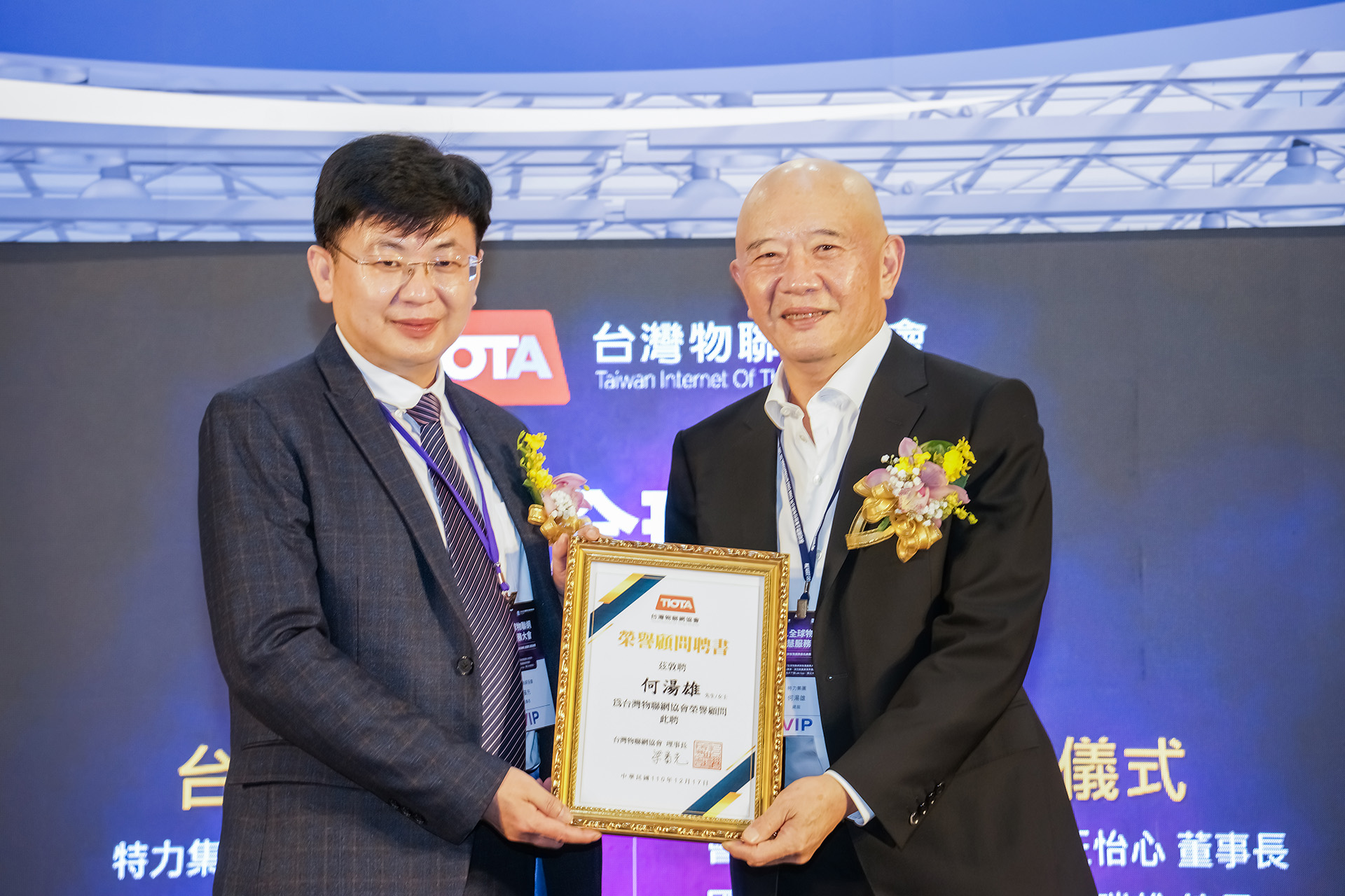 梁理事長授予特力集團 何湯雄總裁(右)台灣物聯網協會榮譽顧問聘書。