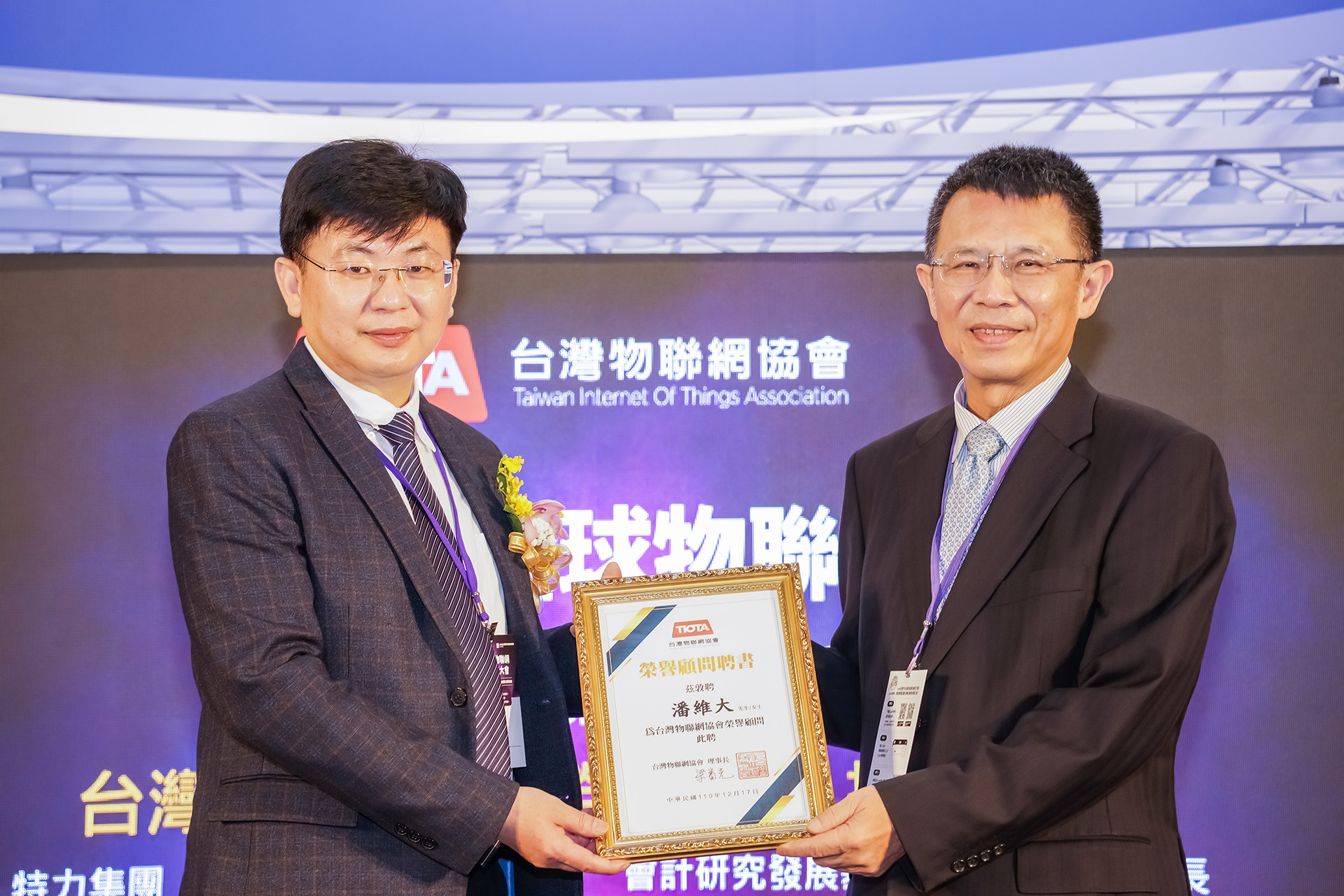 梁理事長授予東吳大學 潘維大校長(右)台灣物聯網協會榮譽顧問聘書。