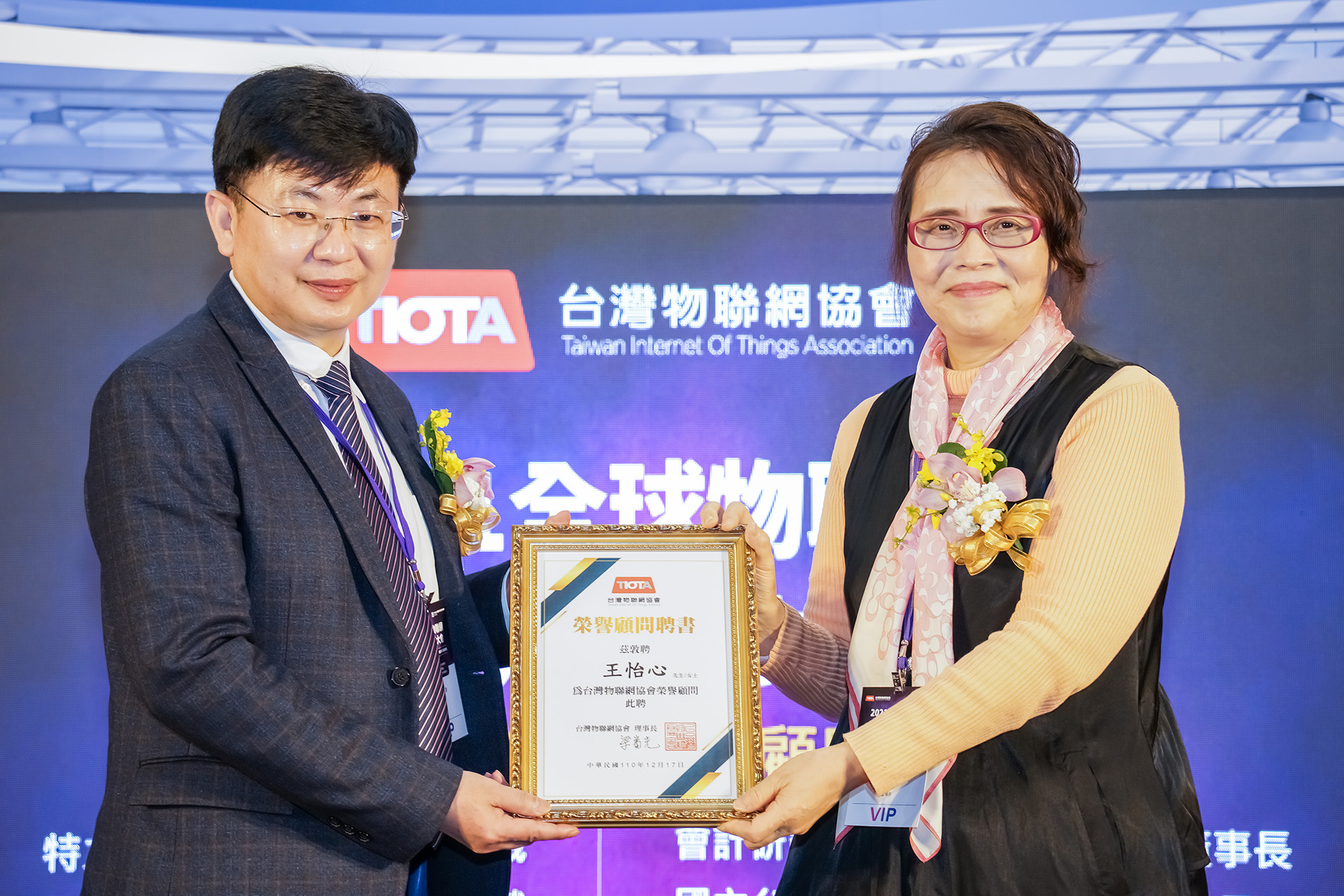 梁理事長授予會計研究發展基金會 王怡心董事長(右)台灣物聯網協會榮譽顧問聘書。
