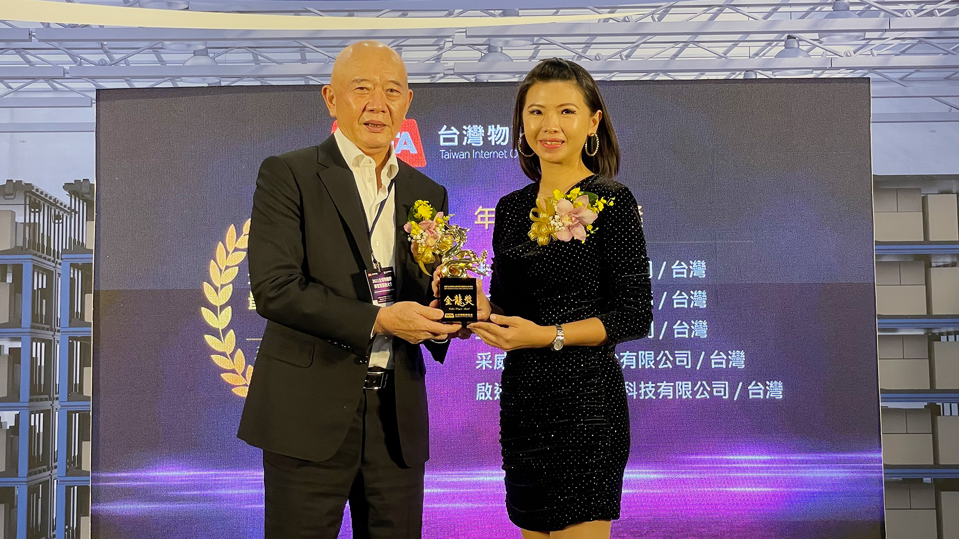 特力集團 何湯雄總裁頒予卡訊電子 吳珮蓉董事長(右)金龍獎獎盃。